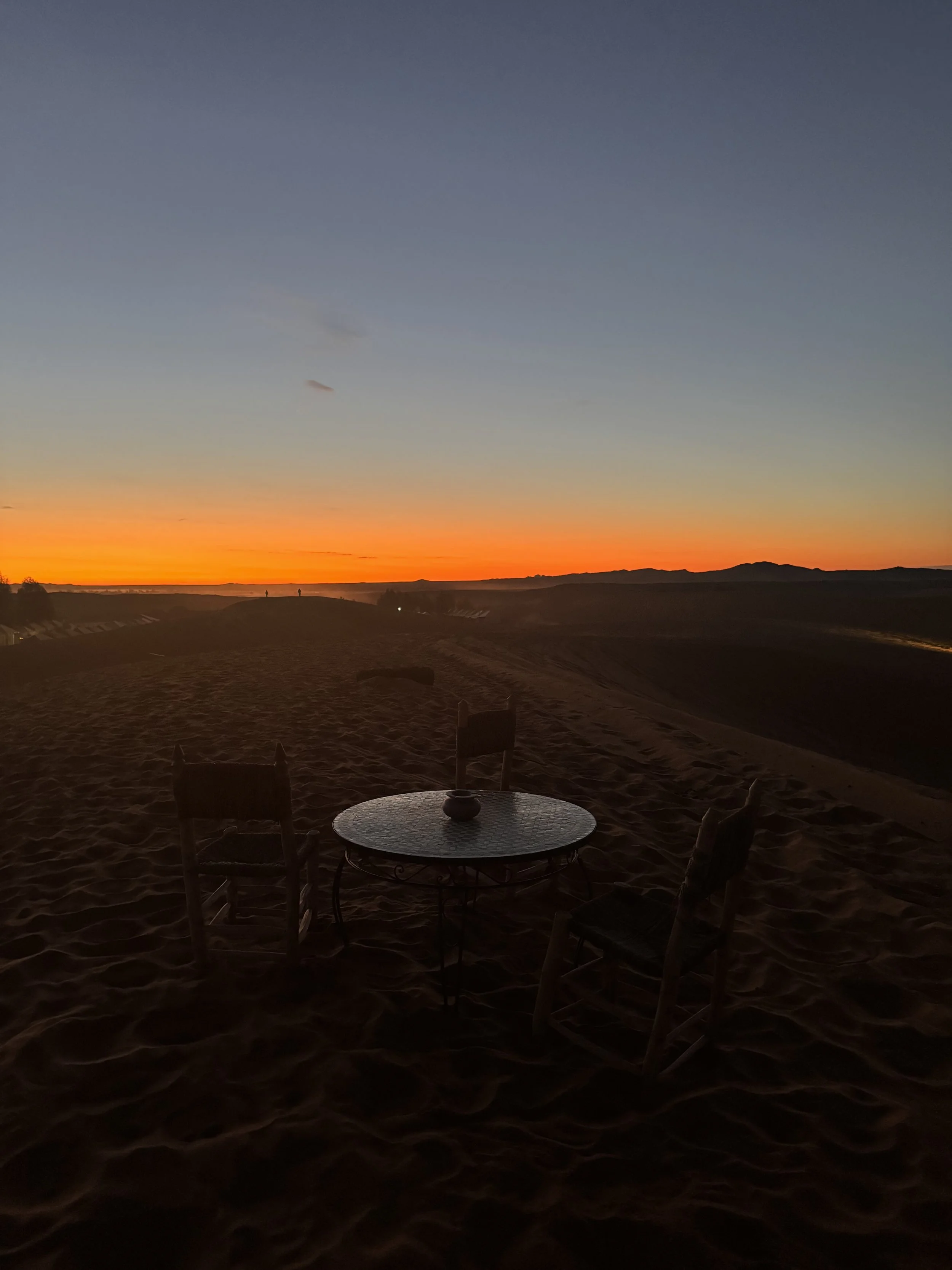 It gets dark real quick here, like flipping a switch and the Berber brothers show up. the OG Beta testers of these terrain, ready to escort the tourists to their desert lair. upon arrival, I’m a little appalled by the sight! hut? Camp? No. This is a full-on Oasis! Beats some of the places I’ve crashed in NYC! hot shower in the middle of the nowhere, hell yes, I’m sold! Then they hit us with the welcome feast, a spread that’d make a king blush and you already guessed it - couscous, tajine and bread! Same same but different sandbox, sure, but in this setting? It hits the spot. The party kicks off—techno starts thumping loud, I see Saidh already doing his drunken camel impression and eyeing me up for the dance floor. Nope. Not tonight, hombre. I’ve got my own agenda: slipping away to wallow under that ink-black sky, roll down a fat dune, feel the sand between my toes. Look up. Nothing but black and diamonds. That’s the MVP. Then, I hear the drums. Distant but insistent, hook in the ear, luring me in and I follow. You always follow. I arrive at something almost like the end scene from Skypeia, just fire and drums, no radio waves or electromagnetic waves detected here. Just warm air drummed to that primordial rhythm. A figment of some fevered, spice-induced dream! This is the real deal; this is why I’m here. Some way to wave the day and the year away.